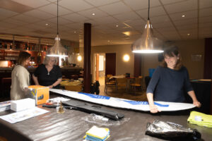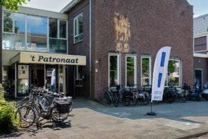 Dit jaar hebben we ook een mooie beachflag laten maken in plaats van het houten bord met pijl. Het is een eyecatcher bij de voordeur van ’t Patronaat en enkele bezoekers hebben aangegeven, door de vlag nieuwsgierig werden en kwamen kijken.